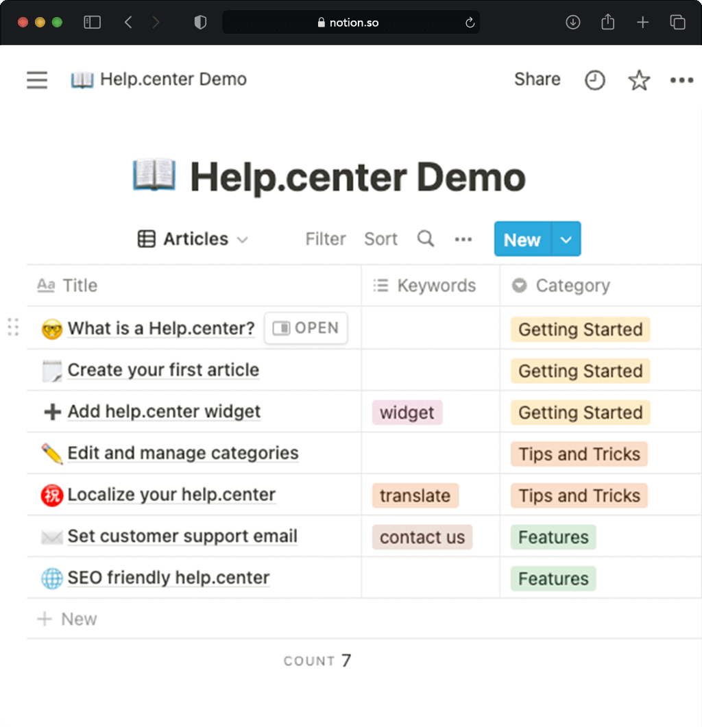 Each row in Notion table is a new help article